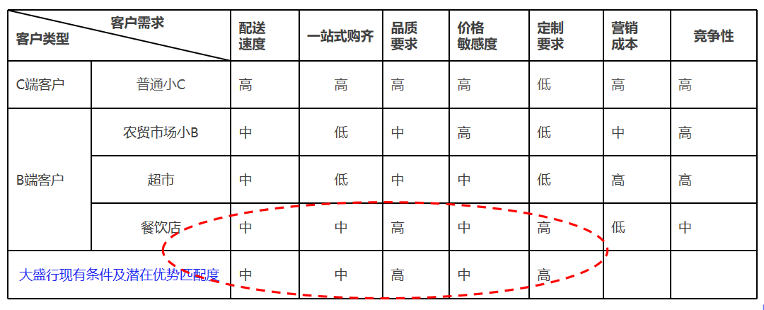 結合大盛行自身優勢,從、客戶需求、營銷成本、競爭格局三大維度,對不同客戶類型從如下角度,作出如下對比: